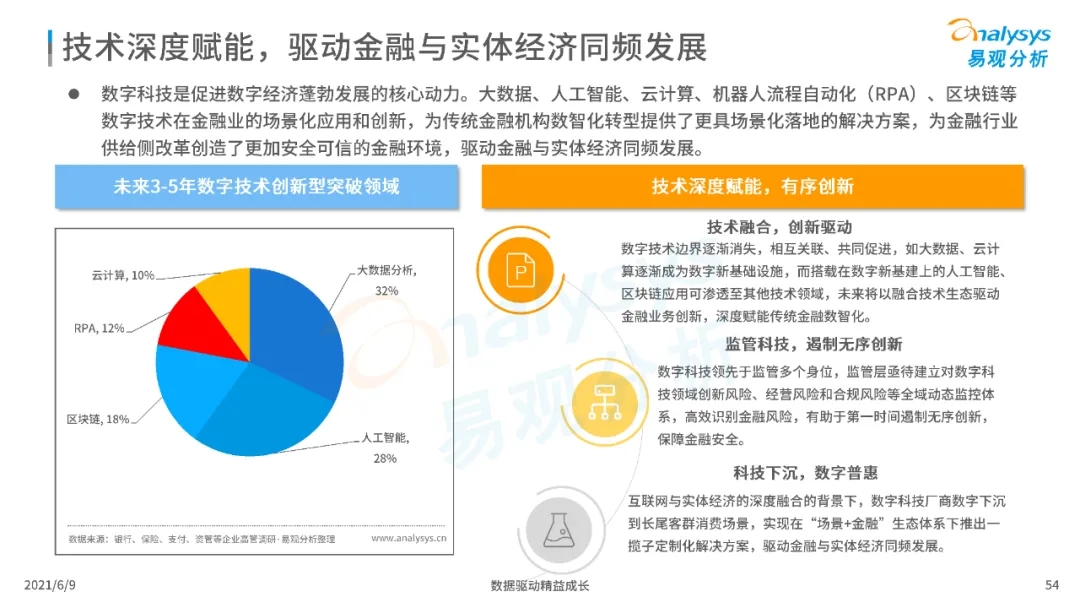 以大数据、人工智能、物联网、区块链等为代表的数字科技驱动金融产业数字化方兴未艾,数字科技使得金融和科技两个领域产生更紧密的场景联结,使得数字科技服务可以更早、更有效地介入到金融产业增长模型中去,更早的融入到企业和个人的资产生成过程,并从根本上提升金融机构资产透视能力和资产定价能力,帮助金融机构和实体部门降低成本、提升效率、增强用户体验及优化业务模式。